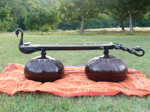 Lo strumento viene decorato con il pavone ed il cigno che sono simboli collegati alla dea Saraswati, ispiratrice e protettrice dei musicisti e degli artisti.